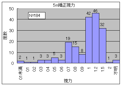 回答者の5m視力(自己申告値)の分布.VDT作業で重要なのは50cm視力である.作業姿勢のページをご覧ください.しかし,5m視力が極端に低い場合は50cm視力も低いと考えられる. |