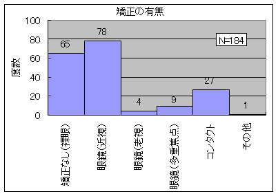視覚負担のページに示したが,視力を矯正している回答者の方が肩の凝りの訴えが有意に多い.視力の矯正自体に問題があるのか,裸眼視力が低いひとが疲れやすいのかは定かではない.ただし,視覚負担のページに示したが,5m視力には非矯正群と矯正群で差は認められなかった. |