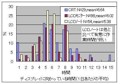 CRTとLCDモニターは1日あたり6時間以上,これは1日6時間以上のディスプレイ作業を平均的に行っていることを意味している.ディスプレイ業界の技術者が多いという前提ではあるが,きわめて長時間コンピュータを利用している実態があらわれている. CRTユーザーに1日平均15時間というユーザーがいる.LCDノートは,CRTとLCDモニターのユーザーと比較すると1日あたりのディスプレイ作業時間は有意に短かったが,それでも1日平均5.38時間におよぶ. いずれも昨年度より延びている. |