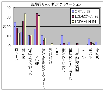 「最もよく使うアプリケーション」とは,「トータルの使用時間が最も長いもの」として回答を得ている. CRTでワープロとソフトウェア開発が若干多いが,LCDモニターとLCDノートの差は小さい.LCDノートをCAD/CAE作業に最も長時間使っているユーザーもいる.電子メールと表計算の利用が比較的多い. 昨年度(2000年)と比較して,LCDユーザーについてはワープロが減り,電子メールと表計算の割合が増加している. |