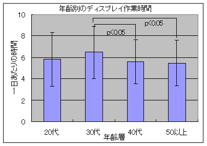 30代のユーザーは40代,50代以上のユーザーより1日あたりのディスプレイ作業時間が有意に長い.20代と30代の間には有意差は認められなかった. |