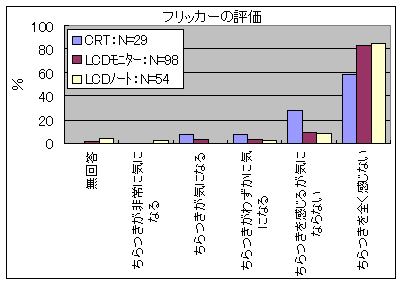 CRTで原理的にフリッカーを感じるユーザーが多いのは当然である.しかし,次の図7-14に示したようにCRTのリフレッシュレイトは75Hzが最頻値で85Hzが次いで多く,周波数が従来よりは高いために「ちらつきが気になる」ユーザーはCRTでも10%以下である. しかし,極端な観察条件での調査ではあるが,いまだに「わずかに気になる」まで含めると10数%のユーザーがフリッカーを気にしていることになる.おそらく,60Hzないし70Hzのユーザーであろう.90%のユーザーがちらつきを感じないレベルになるにはさらに高周波数化が進むであろう. |